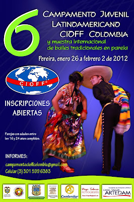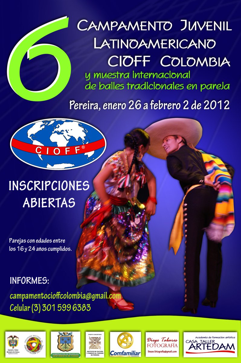 Una vez más se abren las inscripciones para que las parejas de jóvenes bailarines latinoamericanos, interesados en participar del 6° Campamento Juvenil Latinoamericano CIOFF Colombia y muestra internacional de bailes tradicionales en pareja, puedan llegar a nuestra ciudad entre el 26 de enero y el 2 de febrero de 2012.