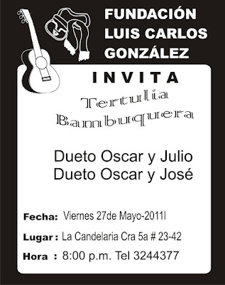 La Fundación Luis Carlos González, invita a los amantes de las músicas de Colombia a una nueva tertulia bambuquera, la cual se realizará el próximo viernes 27 de mayo en el Bar La Candelaria, ubicado en la carrera 5 N° 23 – 42, a partir de las ocho de la noche.